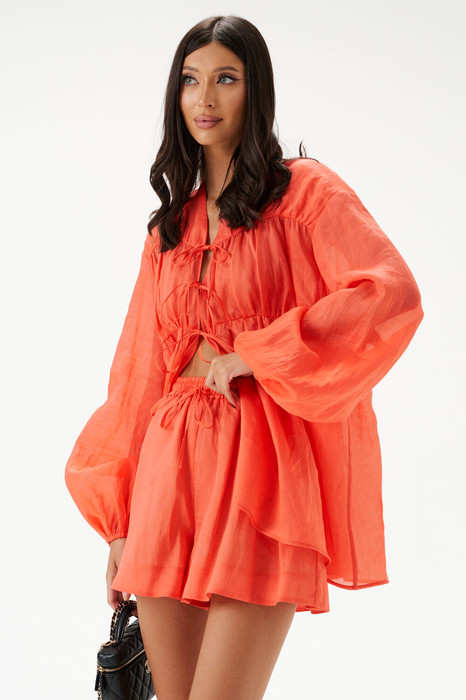 Блуза свободного кроя. Выполнена из полупрозрачного полотна рами кораллового цвета. Вырез горловины V-образный. Рукав втачной, спущенный, низ присборен на резинку. По переду выше линии груди и по спинке отрезная деталь со сборкой, по переду с завязками. Спинка с кокеткой. Длина рукава от линии втачивания 64 см. Длина спинки 70 см