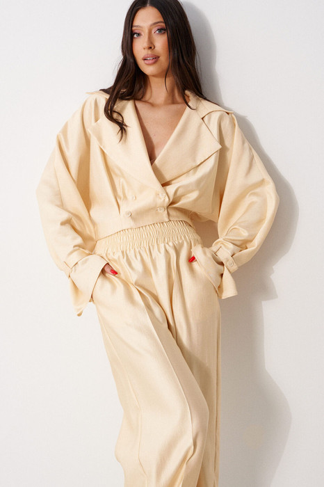 Рубашка свободного кроя, выполнена из мягкой ткани. Характеристики: отложной воротник с остроугольным лацканом, двубортная застежка на пуговицах, крой рукава «летучая мышь», по низу рукава пата с пуговицей, низ изделия на обтачке. Длина спинки 45 см, длина рукава от края горловины 78 см.