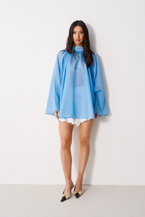 Блузка свободного кроя, выполнена из полупрозрачного полотна синего цвета. Характеристика : свободный крой, воротник стойка сзади на застежке петли пуговицы. Рукав-реглан. Длина рукава от горловины 75см, длина по спинке 74см.