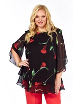 Блуза свободного кроя. Передняя часть на притачной планке, имеющей застёжку на петли-пуговицы. V-образный вырез формирует красивое декольте.