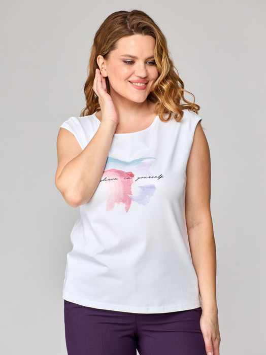 Базовая блуза, из хлопковой трикотажной ткани,перед и спинка цельная. По переду выполнена печать. Длина по спинке 59 см.