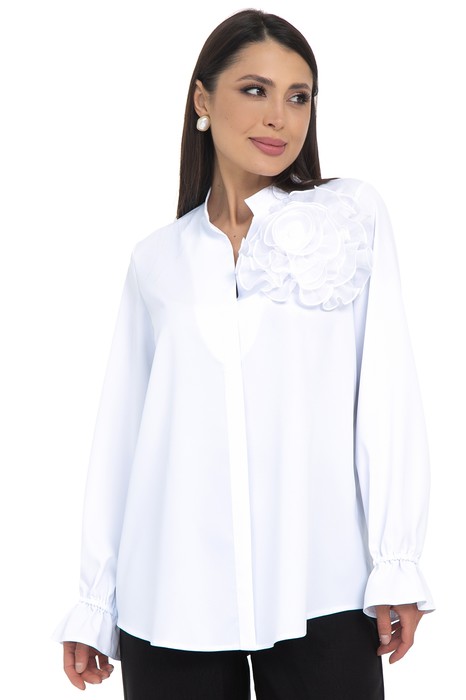 Хит сезона! Необыкновенно красивая и элегантная блуза с изысканным декором- само воплощение женственности. Блузка с изящным цветком из органзы, идеально впишется в любой гардероб: для создания делового образа, повседневного или праздничного. Можно носить как с классическими брюками и юбками, так и с джинсами или под сарафан. Прекрасно смотрится как в заправленном состоянии, так и на выпуск. Шелковистая струящаяся ткань практически не мнется, обладает износостойкостью, обеспечивает идеальный комфорт. Блузка продуманного и универсального фасона, идеально подходящего под любой низ. Воротник стойка, рукав длинный, на резинке с красивой рюшей по низу