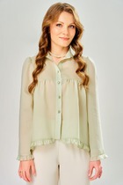 Женская блузка "Найда" выполнена из текстильной ткани "Вуаль Верона", в составе которой присутствует тенсел и полиамид. Блузка, расширенная к низу, застежка однобортная на петли и пуговицы с отрезной планкой. По полочке - кокетка и легкая сборка. Воротник в блузке рубашечного типа со стойкой. По спинке - подрез с легкой сборкой. Рукава в блузке втачные, одношовные. По блузки и рукавов пришита рюша. Это нарядная блузка подойдет для повседневной и нарядной носки с брюками, чтобы могут быть с данным комплектом и юбкой.