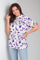Блузка с отрезным воротником- стойкой, центральной застежкой на петли и пуговицы. На полочках расположены накладные карманы с клапанами. Плечо спущенное. Рукав втачной, 3/4 , с патой, закрепленной к рукаву петлей и пуговицей. По низу блузки- притачной пояс, присборенный на резинку.