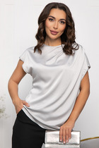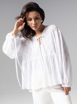 Блузка женская прямого силуэта. По переду обработаны вытачки, застежка притачными планками. Спинка цельнокроеная. По горловине воротник с цельнокроеной стойкой. Рукав длинный одношовный. Воротник и планка выполнены из ткани-компаньона.