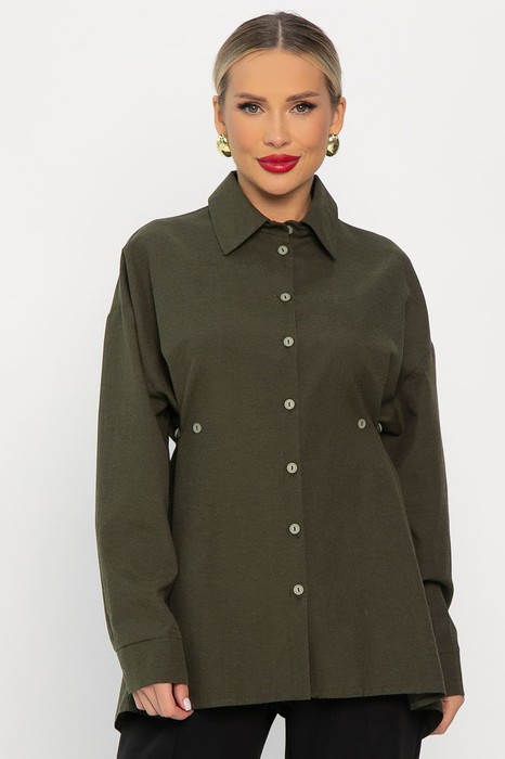 Однотонная оверсайз рубашка — ключевой элемент базового гардероба. Пуговицы, подобранные в тон ткани, придают изделию утонченный вид. Длинные рукава завершаются аккуратными манжетами. Особенностью этой рубашки являются дополнительные пуговицы по бокам спереди, которые помогают подчеркнуть линию талии. На спинке пуговицы декоративные. Рубашку можно носить самостоятельно, дополнив аксессуарами, или надевать поверх топа или футболки, создавая разнообразные образы для любого случая.