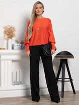 Великолепная трикотажная блуза в красивом оттенке хурмы сочетает в себе комфорт и утонченность. Овальный вырез горловины и цельнокроеные рукава «летучая мышь» придают ей уникальный вид. Высокий манжет по низу рукавов добавляет изысканности. Эта блуза отлично сочетается с юбками, брюками и джинсами любого фасона, создавая разнообразные модные образы. В комплекте идет подвеска, которая станет ярким акцентом и подчеркнет вашу индивидуальность.