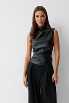 Блуза прилегающего силуэта из экокожи с ассиметричным низом. Горловина с  цельнокроеной  стойкой. По переду декоративные складки, выходящие из плеча и бокового шва. На спинке в центральном шве потайная молния и талиевые вытачки.