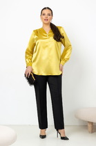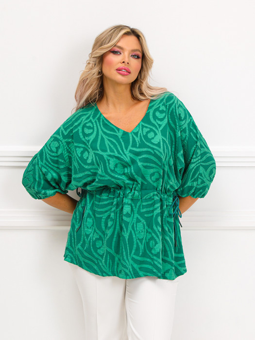 Роскошная туника прямого силуэта из текстильной ткани зеленого цвета. V-образный вырез обработан внутренней обтачкой. Цельнокроеные рукава обработаны резинкой. Линия талии эффектно подчеркнута кулиской со шнурками. Длина изделия по спинке от плечевого шва до низа изделия — см.