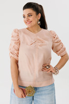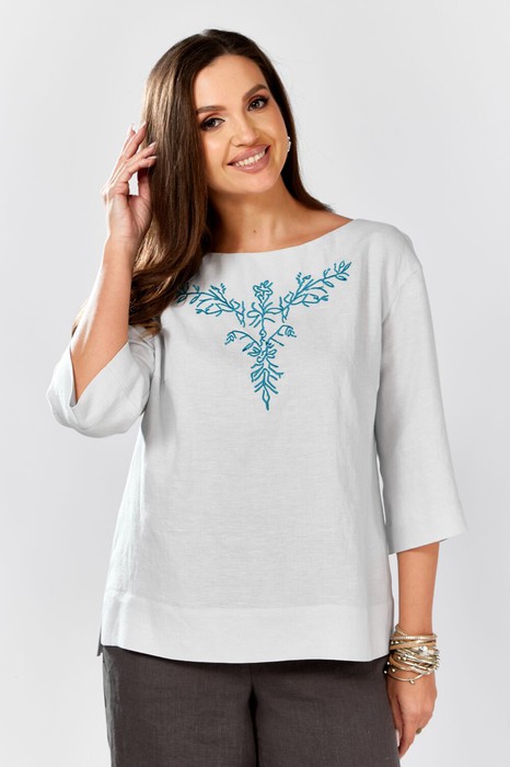 Блуза прямого силуэта. В боковых швах разрезы . Низ разноуровневый. По переду нагрудные вытачки и декоративная вышивка. Спинка со средним швом.Плечо немного спущено. Рукав рубашечного покроя , 3/4, слегка расширен к низу. Горловина "лодочка".