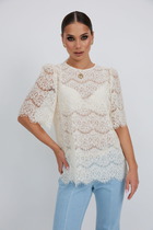 Блуза прямого силуэта.В боковых швах разрезы.Спинка со средним швом. По переду нагрудные вытачки . Горловина с V - образным вырезом , украшена декоративной вышивкой. По плечевому шву обработана кулиса с завязками из основной ткани.