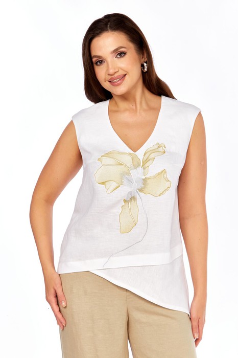 Блуза прямого силуэта. По переду нагрудные вытачки от боковых швов, декоративная вышивка. Низ ассиметричный с отрезной деталью. разрез в левом боковом шве. Плечо слегка спущено. Горловина с V- образным вырезом.