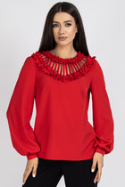 Нарядная блузка из атласной ткани. На полочке складки, небольшой V-образный вырез и декоративная стойка. Спинка со средним швом и застежкой на молнию. В боковых швах по низу разрезы