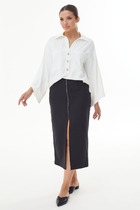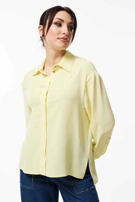 Блуза женская свободного силуэта с центральной застежкой на потайные кнопки. Рукав втачной, рубашечного типа с притачной манжетой на кнопке. По спинке отрезная кокетка, от екоторой по центру идет встречная складка. Воротник с отрезной стойкой. Низ изделия разноуровлевый, в боковых швах разрезы.
