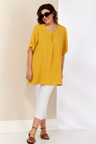 Современная женская блузка свободного силуэт. Полочка изделия с нагрудными вытачками и вырезом “капелькой”. Рукав прямой, втачной, по низу также вырез “капелька”. Горловина обработана обтачкой, переходящей по спинке в навесную петлю на пуговицу. Спинка блузы прямая стачная. По талии, по боковым швам закреплены шлевки для пояса.