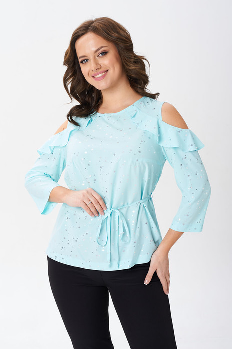 Женская нарядная блузка с пояском из основной ткани и воланами. По переду нагрудные вытачки. Спинка блузки с вырезом капелькой и застёжкой на пуговицу. В швы кокетки вставлен волан переходящий на рукав. Рукав длинной за локоть.