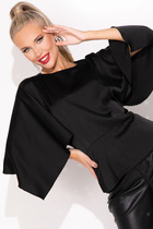Блузка из мягкого блузочного атласа, прямого силуэта, с рубашечным воротником и застежкой на три пуговицы на планке до середины блузки. По переду блузка удлинена и низ переходит в завязку. Рукав трехчетвертной на манжете, на одну пуговицу.