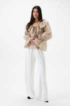 Шикарная блузка из струящейся ткани с матовым блеском, рубашечным воротником и застежкой на петли и пуговицы, нагрудными вытачками. Рукав длинный на манжете, застегивающийся на пуговицы. По боковым швам разрезы.
