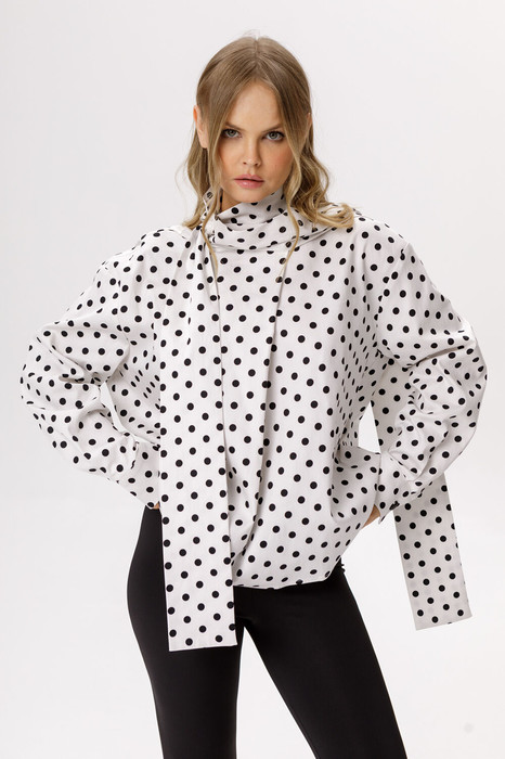 Хлопковая свободная блуза в горохи со стойкой-бантом.
