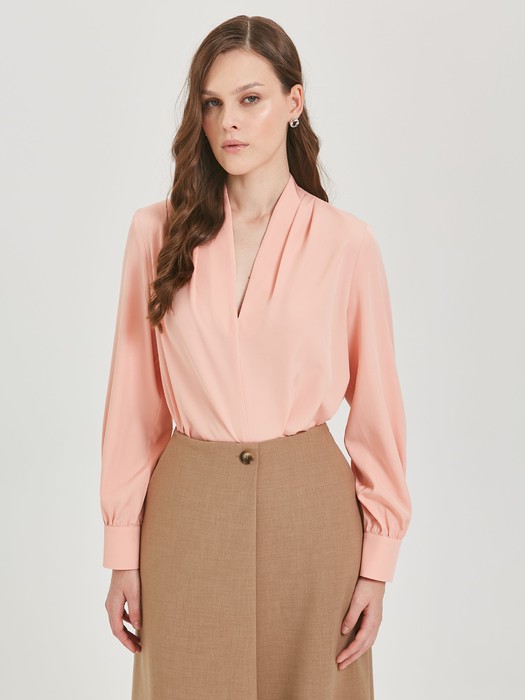 Модель прямого силуэта, с цельнокроеным воротником стойкой и V-образным вырезом горловины. Перед со средним шом и защипами по плечевым швам. По низу рукава разрез, сборка и манжета с застёжкой на пуговицы.
