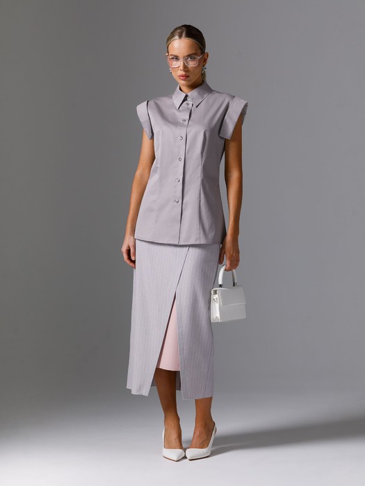 Модель полуприлегающего силуэта, с рельефами, без боковых швов, без подклада. Спереди центральная застёжка на петли и пуговиы. Воротник сорочечный. Пройма частично обработана отложной манжетой.