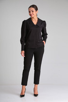 Блузка из мягкой вискозной ткани свободного силуэта со спущенной линией плеча. Горловина по полочке округлой формы, по спинке – V-образный вырез, который соединён планкой. Рукав втачной, длинный. Низ блузки и низ рукавов присобраны на декоративный трикотажный довяз.