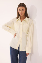 Рубашка женская прямого силуэта с центральной застёжкой на петли и декоративные пуговицы, выполнена из хлопчатобумажной ткани. Боковые швы полочки и спинки имеют фигурную форму и соединяются между собой застёжкой на петли и декоративные пуговицы. Воротник рубашечный, отложной на стойке. Рукав втачной, одношовный, длинный с манжетой, которая застёгивается на петлю и пуговицу, и патой, которой регулируется длина рукава. Низ рубашки разноуровневый, полочка короче, спинка -длиннее.