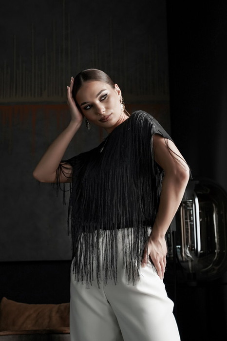 Блузка свободного силуэта с коротким цельновыкроенным рукавом, из нарядной плательно-блузочной ткани с бахромой. По переду горловина округлой формы, по спинке-V-образной. Блузка на атласной подкладке. Длина 58 см.