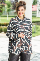 Безумно красивая и стильная блузка с акцентом в виде яркого принта. Принт с абстрактным анималистическим узором, напоминающим окрас зебры, выполнен в глубоких оттенках коричневого, черного и молочного, придавая изделию уникальный и выразительный вид. Блузка «оверсайз» с центральной застёжкой на петли-пуговицы по планке, воротником рубашечного типа. Спинка с притачной кокеткой. Линия плеча в блузке спущенная, рукав втачной с притачной манжетой по низу. Низ в блузке фигурной формы. В качестве декоративного отделочного элемента в блузке – отделочные строчки контрастного цвета. Обращаем Ваше внимание, что фурнитура может незначительно отличаться от фото.