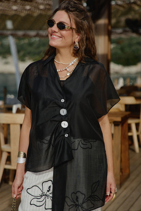 Комплект женский двух предметный, состоящий из блузки и блузы. Блузка свободного силуэта с ассиметричной линией борта с заложенными складками, имитацией застёжки на декоративные пуговицы. Горловина в блузке с отложным воротником со стойкой. Рукав в блузке цельнокроеный. Спинка с отрезной кокеткой. Низ в блузке ассиметричный с разрезами в боковых швах. Блуза прямого силуэта на регулируемых бретелях со вставкой эластичной тесьмы-резинке по спинке. В боковых швах от низа разрезы. Обращаем Ваше внимание, что фурнитура может незначительно отличаться от фото. Длина блузы спинки от плеча 69 см(р.52-56), 72 см (р.58-60). Длина переда правого 70 см (р.52-56), 73 см (р.58-62). Длина переда левого 84 см (р.52-56), 87 см (р.58-62). Блузка (топ) 43 см (р.52-56), 45 см (р.58-62).