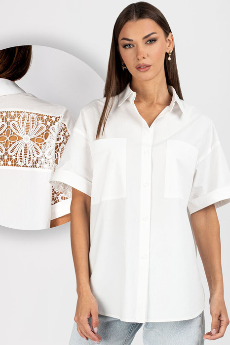 Блузка-рубашка женская прямого силуэта со спущенным плечом.