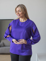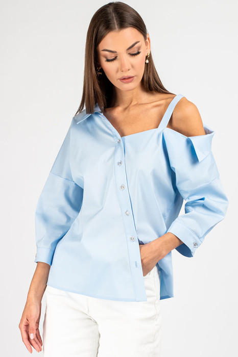 Блузка прямого силуэта со спущенным плечом.