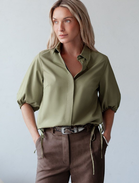 Состав: 100%Хлопок Параметры модели на первом фото: Рост 170, бюст 89, талия 63, бедра 92 Размер товара на первом фото: 42Укороченная блузка с пышными рукавами-фонариками выполнена из легкого хлопкового поплина. Супатная застежка на пуговицы из натурального перламутра. Внизу кулиса с лентами из основного полотна. В изделии будет комфортно, даже в самое жаркое время года. Подходит для любой фигуры. Сочетается в костюме с кюлотами D24.233 и юбкой D26.179