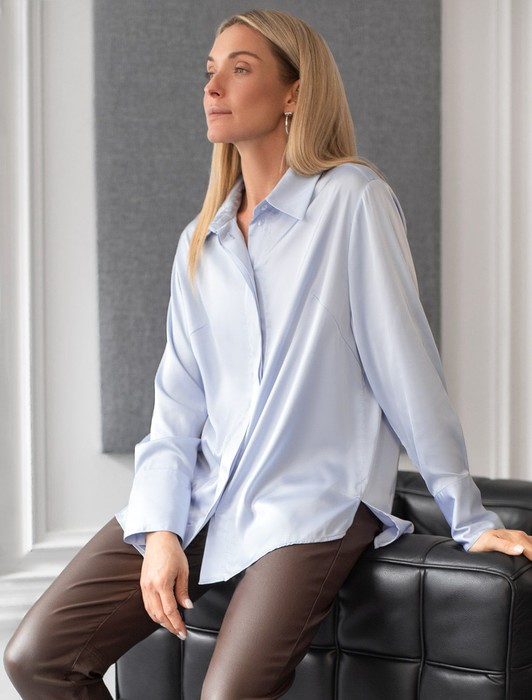 Состав: 94%ПЭ 6%ПУ Плотность: 107 Г/м2 Параметры модели на первом фото: Рост 170, бюст 89, талия 63, бедра 92 Размер товара на первом фото: 42Сатиновая блузка с эластаном в голубом цвете – воплощение элегантности и комфорта. Благородный блеск сатина добавляет образу шика, а эластичность материала гарантирует удобство при носке. Прямой силуэт блузки обеспечивает комфорт, а эластичность материала предотвращает деформацию. Застежка-планка с потайными пуговицами придает модели аккуратность. Универсальный вариант для casual-образов.
