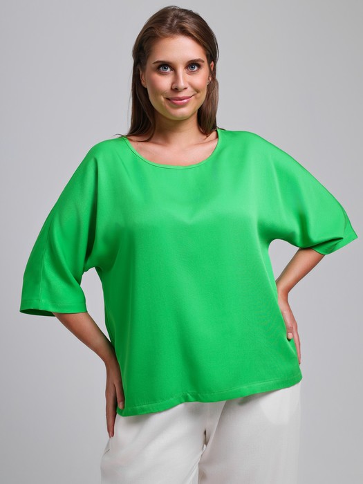 Блуза женская из гладкокрашеного тканого штапельного полотна, свободного кроя с горловиной овальной формы, обработанной окантовкой из основного материала, с цельнокроеными рукавами длиной до локтя.