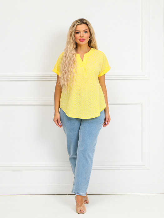 Легкая блузка из хлопка с декоративным шитьем. Изделие прямого силуэта и цельнокроенными рукавами. Горловина обработана воротничком - стойкой. По низу рукавов узкие манжеты с отворотами.