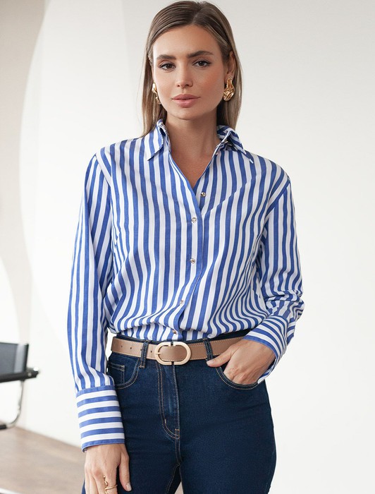 Состав: 65%Хлопок 35%ПЭ Плотность: 100 Г/м2 Параметры модели на первом фото: Рост 170, бюст 89, талия 63, бедра 92Блузка свободного силуэта выполнена из смесовой струящейся ткани. Модель в вертикальную полоску дополнена золотистыми рельефными пуговицами. Свободный силуэт подходит для любой фигуры. Для идеального роскошного образа используйте в качестве низа брюки светлых тонов. На спинке изделия фирменный металлический логотип бренда.