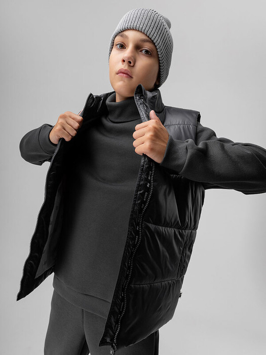 Стильный жилет для детей школьного возраста. Материал FITSYSTEM имеет специальное водонепроницаемое и водоотталкивающее покрытие и пропитку, защищает от дождя, влаги и ветра. Материал верха: Fitsystem Style 100% полиэстер, утеплитель Hetta micro premium S4-K 150 г/кв.м, подкладочный материал кулирная гладь 100% хлопок