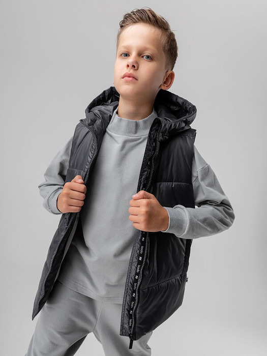 Стильный жилет с капюшоном для детей школьного возраста. Материал жилета FITSYSTEM имеет специальное водонепроницаемое и водоотталкивающее покрытие и пропитку, защищает от дождя, влаги и ветра. Материал верха: Fitsystem Style 100% полиэстер, утеплитель Hetta micro premium S4-K 150 г/кв.м, подкладочный материал кулирная гладь 100% хлопок