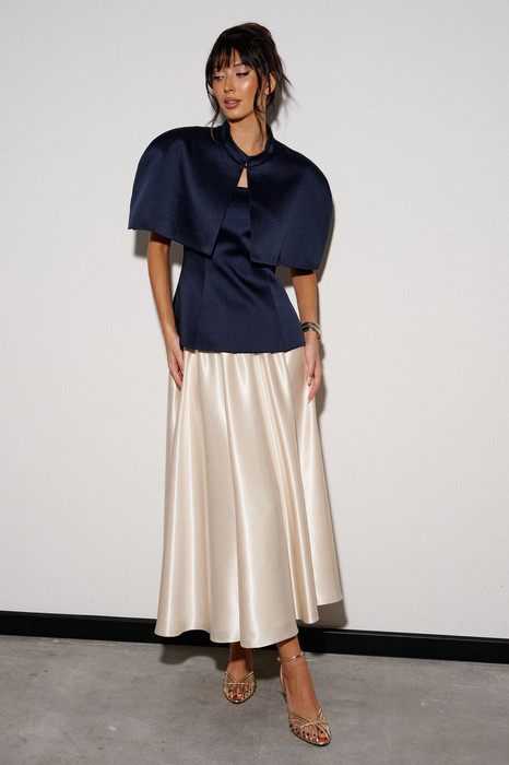 Кейп выполнен из костюмной сатиновой ткани глубокого синего цвета. Характеристики: горловина стойка, застежка центральная на крючок, подплечники, брендированная подкладка. Длина по спинке 33см.