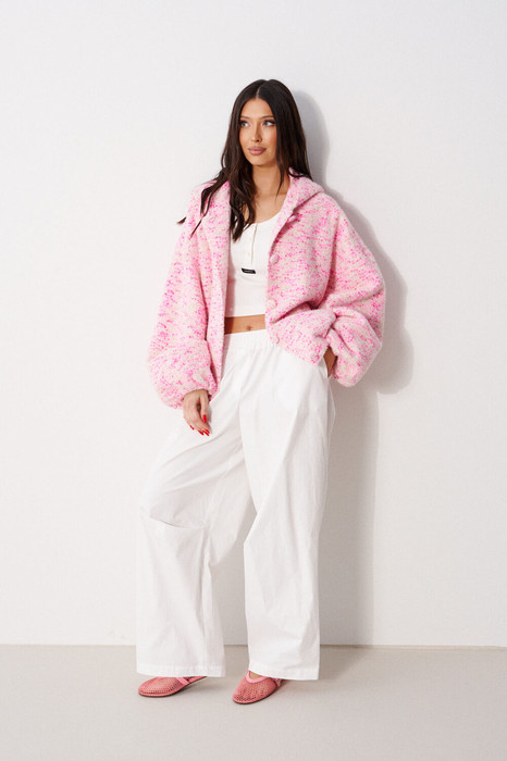 Жакет (бомбер) женский, прямого силуэта , на подкладке. Выполнен из трикотажного полотна бежево-розового цвета. Характеристика: горловина круглая с притачным капюшоном. Линия плеча спущенная. Рукав длинный, одношовный, втачной. По низу присборен на резинку. По деталям полочки прорезные карманы с накладными листочками. Спинка цельная. Застежка центральная бортовая, застегивающаяся на прорезные петли и пришивные пуговицы. Длина рукава от горловины 82 см, длина по спинке 63 см.