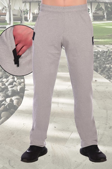 Мужские брюки современного дизайна из футера, по бокам карманы на молнии, отделанные плащевкой и украшенные декоративной кнопкой. Без манжет. Пояс на резинке.