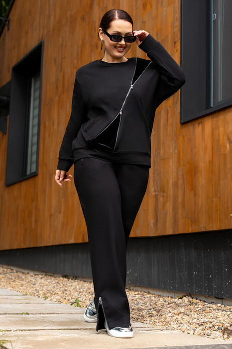 Брюки  женские  прямого  силуэта, пояс  на  резинке.Боковые  карманы  на   молниях.По  низу  брюк  обработаны  разрезы  на  молниях.