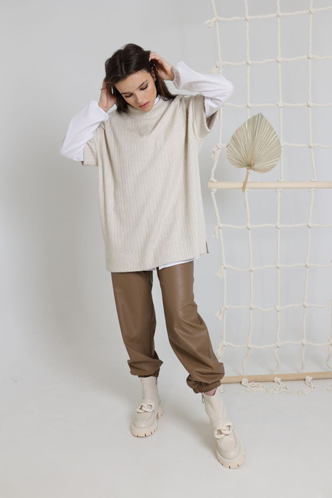 Брюки из эко-кожи на хлопковой основе с резинкой по талии, боковыми карманами и резинкой по низу.