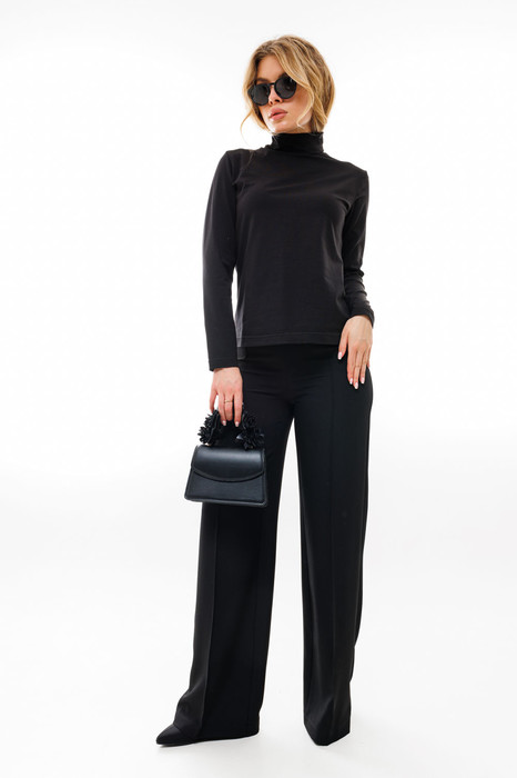 Элегантные,  с высокой посадкой и красивым облеганием бедра брюки. Застроченные стрелки прилают стройности и шика. Низ брюк умеренно широкий. Ноги при таком крое учеличиваются в длине. Застежка на потайную тесьму-молнию в  боковом шве