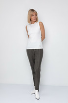 Брюки со стрелками, зауженные к низу. По передним половинкам выполнены наклонные карманы и складки по талии. По задним половинкам обработаны талиевые вытачки. В среднем шве передней половинки брюк обработана застежка на молнию. Брюки на притачном поясе с эластичной тесьмой и застежкой на петлю и пуговицу.