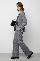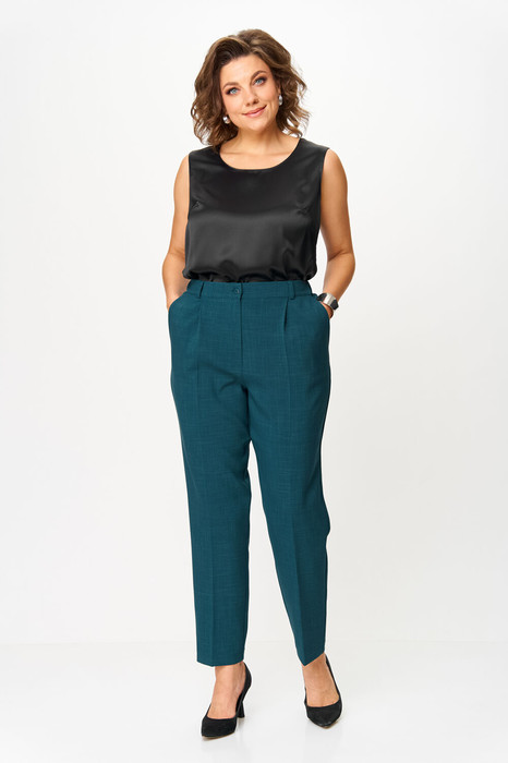 Брюки со стрелками, зауженные к низу. По передним половинкам выполнены наклонные карманы и складки по талии. По задним половинкам обработаны талиевые вытачки. В среднем шве передней половинки брюк обработана застежка на молнию. Брюки на притачном поясе с эластичной тесьмой и застежкой на петлю и пуговицу.