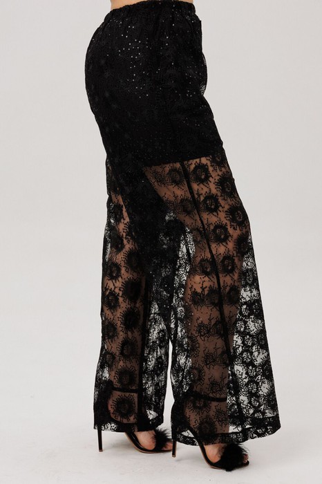 Волнующий шёпот гипюра и танец мерцающих пайеток. Эти брюки «звездная паутинка» не просто деталь образа, а его поэтичное завершение, где дерзость встречается с изящностью.