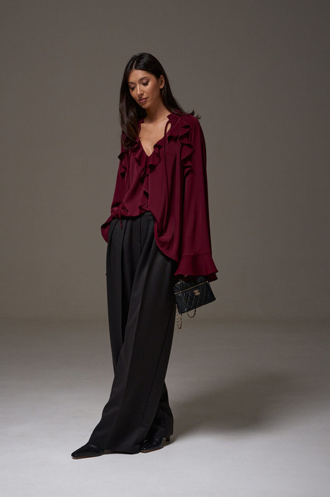 Брюки прямого кроя выполнены из ткани черного цвета.Характеристики: прямой крой, эластичная брендированная резинка, боковые карманы, на передней и задней частях брюк застрочены складки и заутюжены стрелки. Длина брюк 112 см