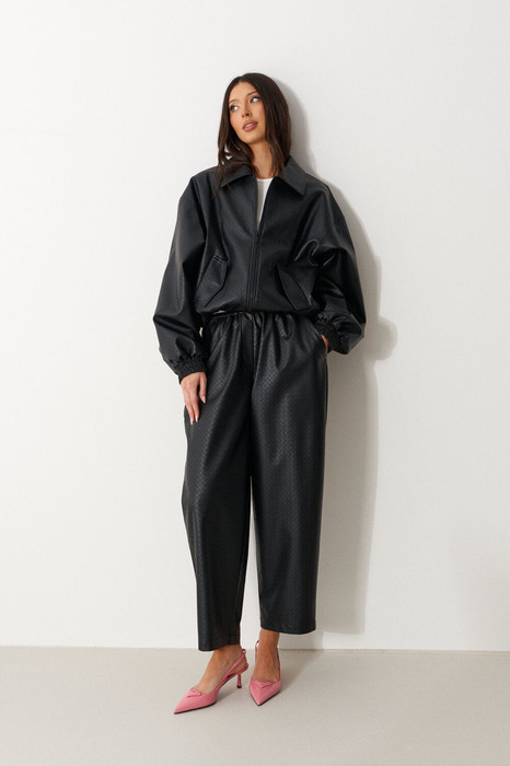 Брюки прямого кроя, выполнены из фактурной эко-кожи черного цвета. Характеристика: прямой крой, пояс на резинке, спереди есть имитация гульфика, без подкладки, в боковых швах карманы. Длина изделия по боковому шву 96 см.